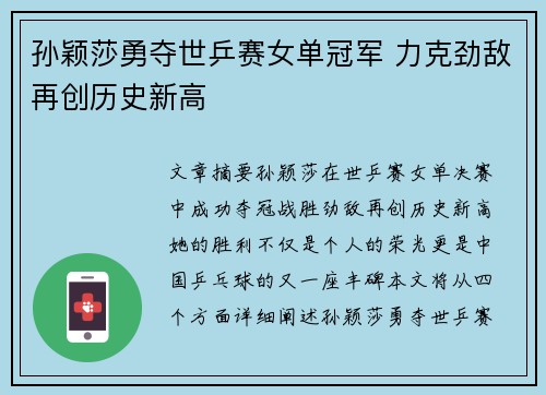 在乒乓球的世界里,孙颖莎以其出色的表现和稳定的技术,逐渐成为了新一代乒乓球选手中的佼佼者。在最近的一场比赛中,孙颖莎凭借无可匹敌的实力,横扫对手成功晋级决赛。这场比赛不仅展现了她的高超球技,更显示了她在大赛中的心理素质和决胜时刻的冷静。本文将从四个方面详细分析孙颖莎横扫对手的精彩表现,探讨她在比赛中展现出的强大实力,深入挖掘她在乒乓球坛的崛起之路。首先,我们会回顾孙颖莎的比赛表现,分析她为何能够在...