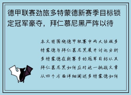文章摘要:德甲联赛进入白热化阶段,赛季争冠的形势愈发扑朔迷离。在各队角逐激烈的过程中,拜仁慕尼黑和多特蒙德的对决成为关键之战,决定了最终的冠军归属。拜仁在近几个赛季中的稳定表现和多特蒙德的强势崛起让两队的对决充满悬念。除此之外,其他劲旅如莱比锡和弗赖堡的崛起也为争冠局势增添了更多变数。本文将从球队表现、球员状况、战术对抗、以及赛季剩余的关键赛事四个方面,对当前德甲赛季的竞争态势做出详细阐述,探讨拜...