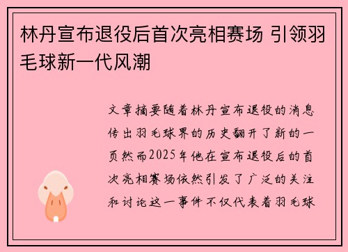 林丹,这位羽坛传奇的名字几乎是中国羽毛球的代名词。他在过去的数十年里,不仅以个人的卓越成绩让世界为之瞩目,更通过一场又一场精彩的比赛为羽毛球这项运动赢得了更广泛的关注。2019年,林丹宣布暂别赛场,但岁月无情,岁月也不过是时间的流转。2025年,林丹决定重返赛场,挑战年轻一代,试图以自己的坚持和经验再次掀起羽毛球界的风暴。面对新一代充满活力、技术日渐精湛的羽毛球选手,林丹的重返赛场无疑成为了羽毛球...