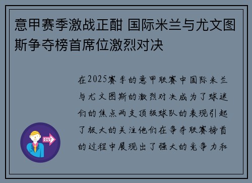 意甲联赛迎来激烈角逐 尤文图斯与AC米兰争夺冠军宝座